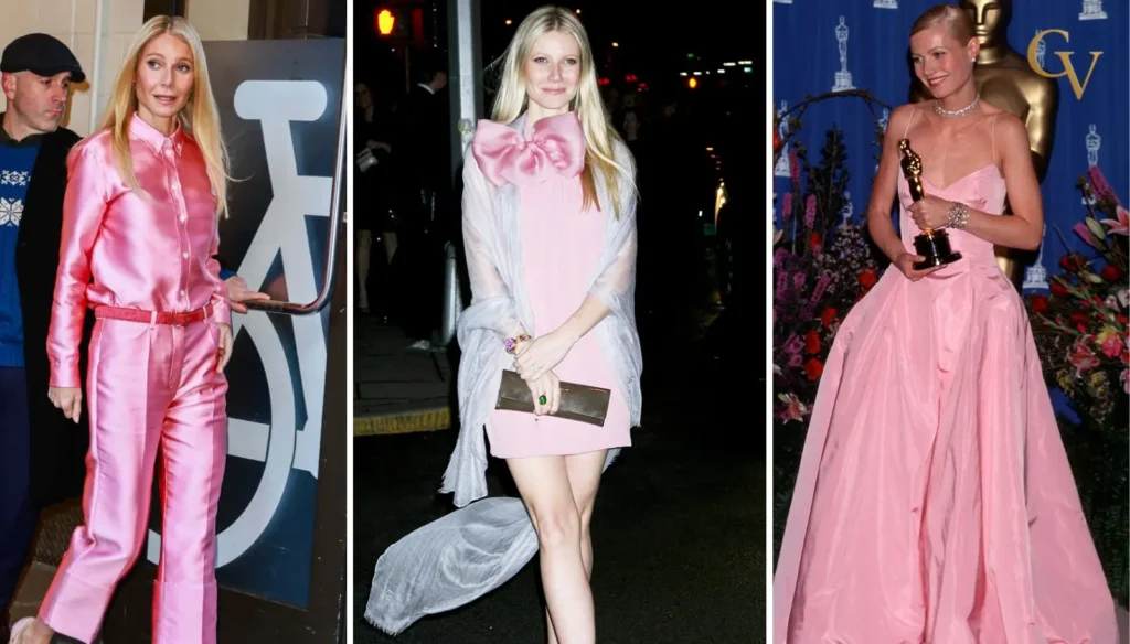 Paltrow’s all-pink ensemble blended tailored structure with modern confidence, transforming the Barbiecore trend into something sleek and professional. The satin-like texture, sharp tailoring, and confident silhouette gave the look a business-meets-bold feel rather than playful costume dressing.